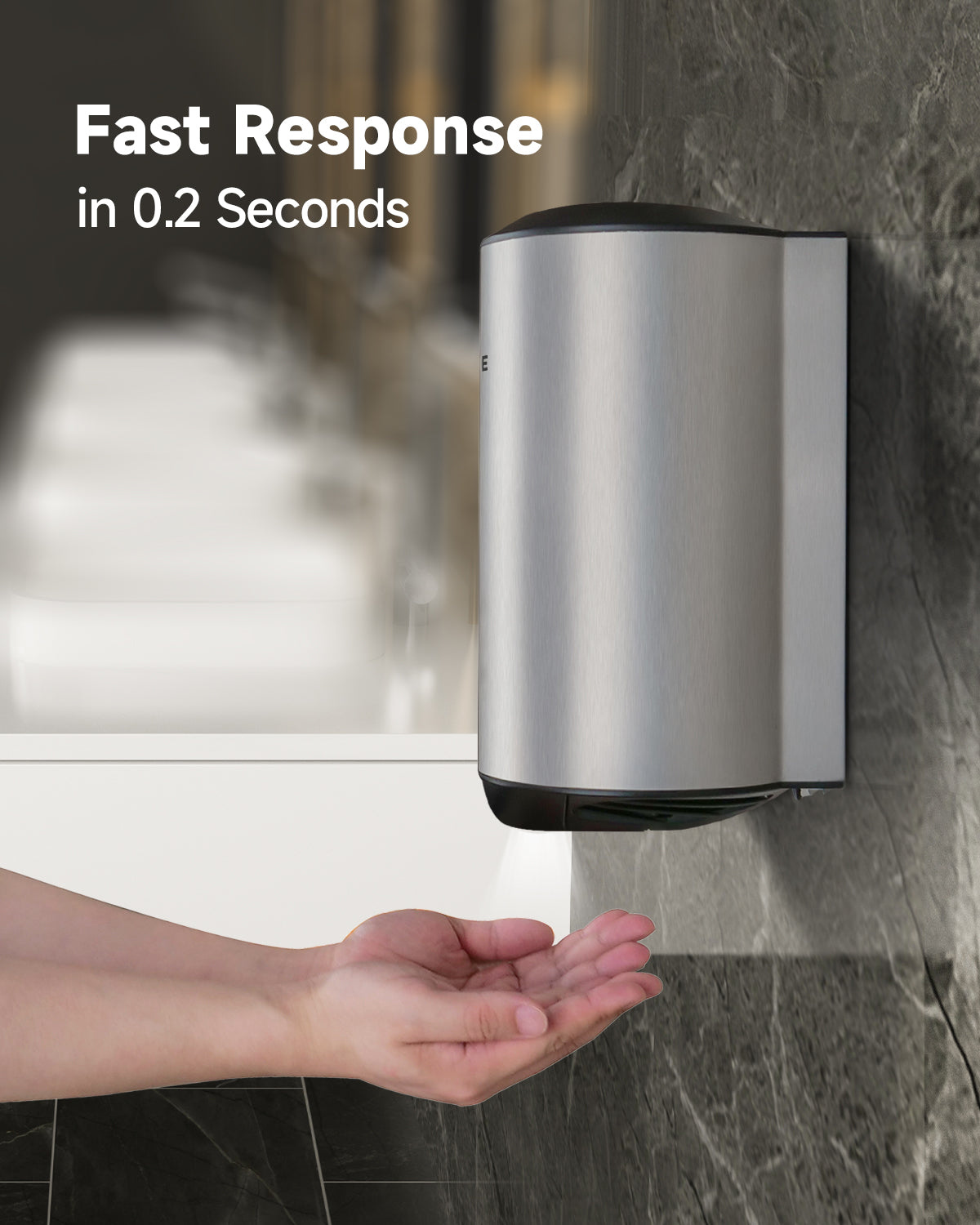 Crafted with a sleek, dark beer look design, this UL approved hand dryer is designed to look sleek while delivering a focused air that dries your hands within seconds.