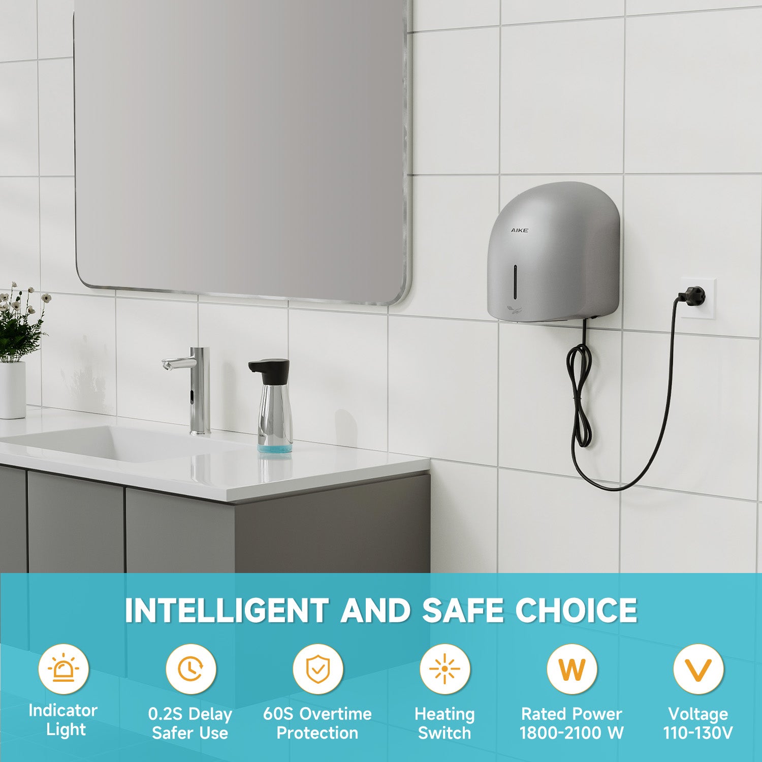 AIKE Low Noise Warm Hand Dryer for Home Bathroom , Easy Installation, 1500W-1900W,AC110V-130V, Model AK2637 - Silver is backordered and will ship as soon as it is back in stock.