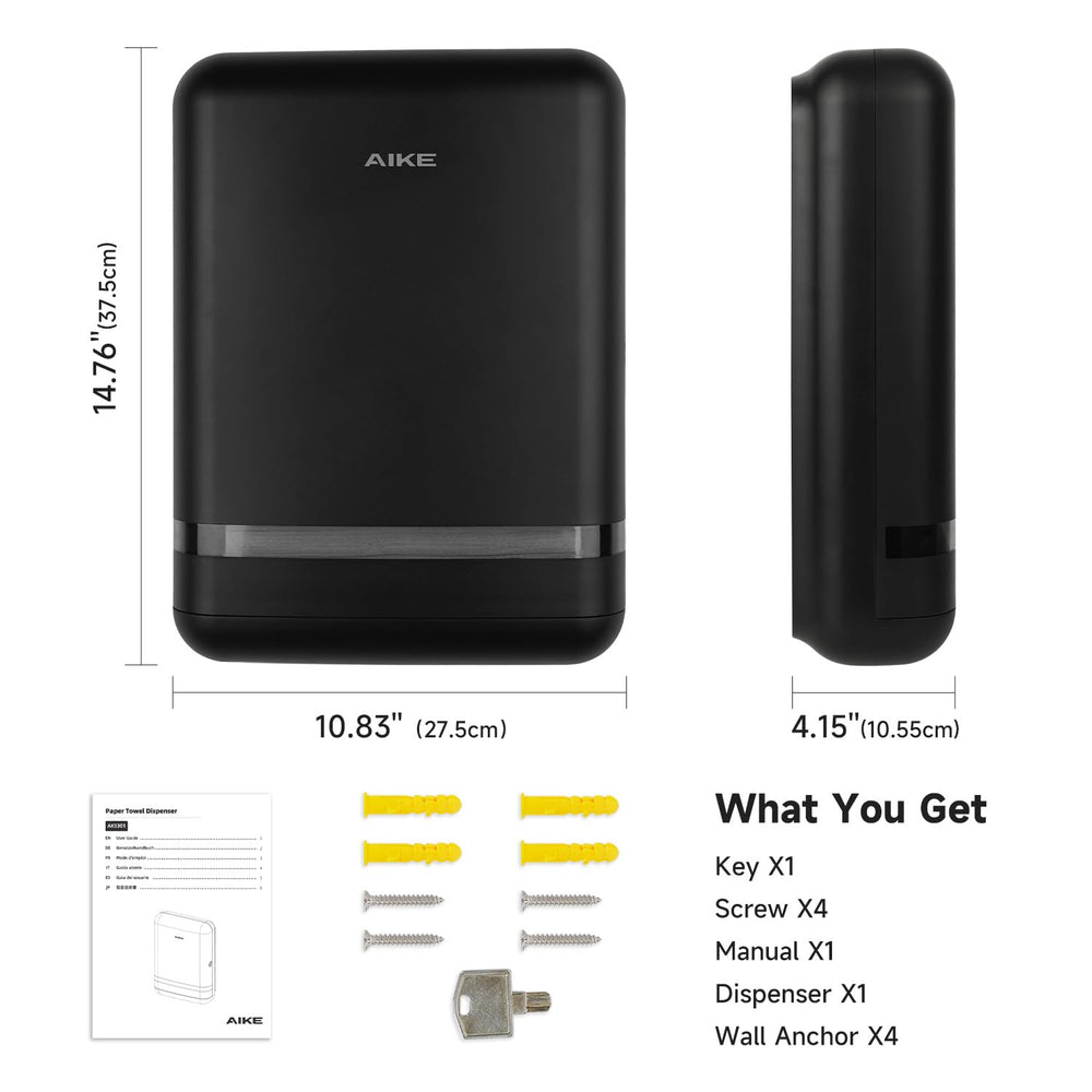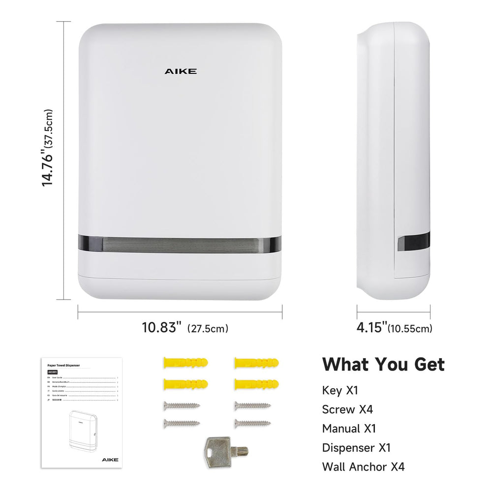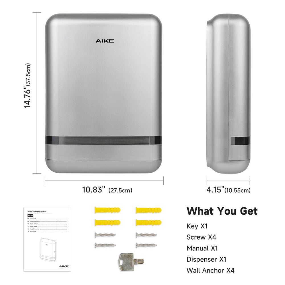 Mit dem wandmontierten AIKE-Spender ak5101 haben Sie schnell und bequem Zugriff auf Papierhandtücher. Sein klares Fenster und der intelligente Verschluss erleichtern das Nachfüllen, während die verstellbare Größe für die meisten Handtücher geeignet ist. Genießen Sie 1 Jahr Sicherheit mit der mitgelieferten Herstellergarantie.