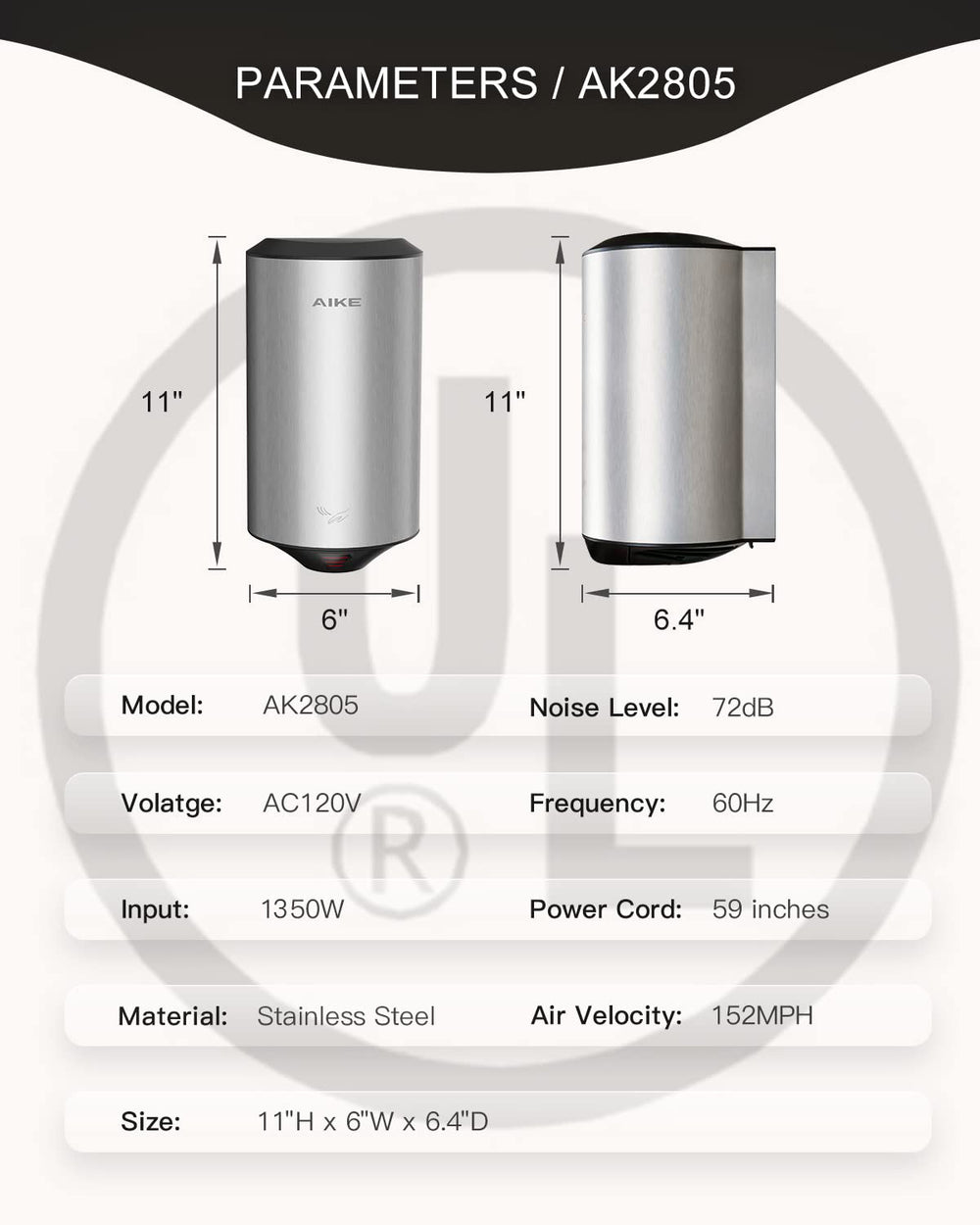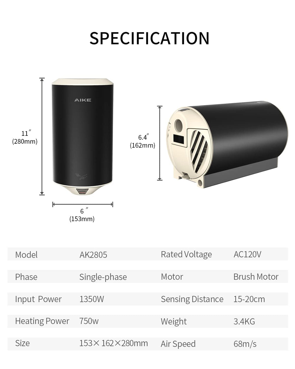 Secador de manos eléctrico AIKE Air Focus aprobado por UL, AK2805