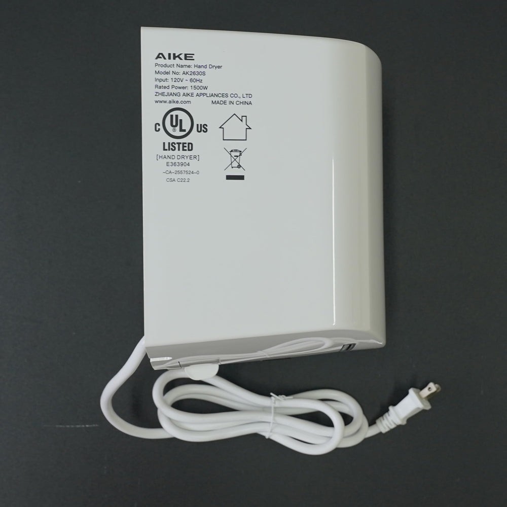 Manos limpias y libres de gérmenes en 10 segundos con el secador de manos compacto AIKE Air Wiper (AK2630S). Diseño que ahorra espacio y se adapta a espacios reducidos; construcción duradera para uso intensivo.